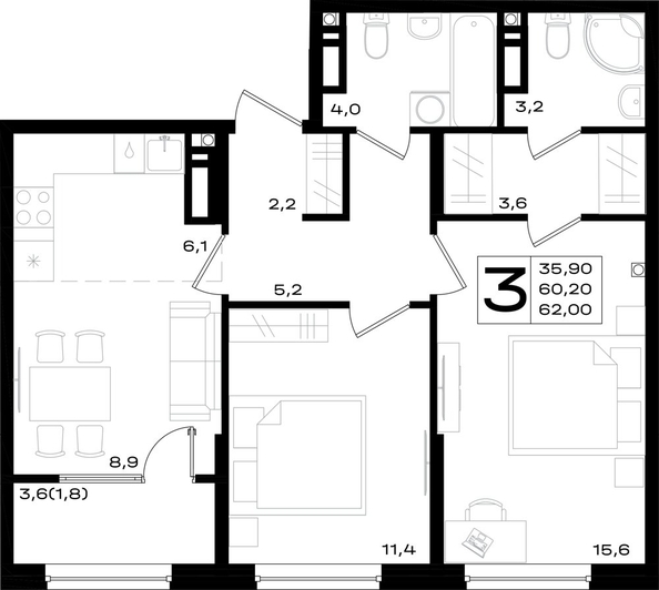 Общая площадь квартиры — 62 кв.м. Тип дома — монолит-блок. Компания-застройщик — ССК.