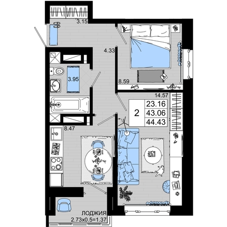 Общая площадь квартиры — 44.43 кв.м. Тип дома — монолит-кирпич. Компания-застройщик — ССК.