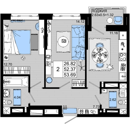 Общая площадь квартиры — 53.69 кв.м. Тип дома — монолит-кирпич. Компания-застройщик — ССК.