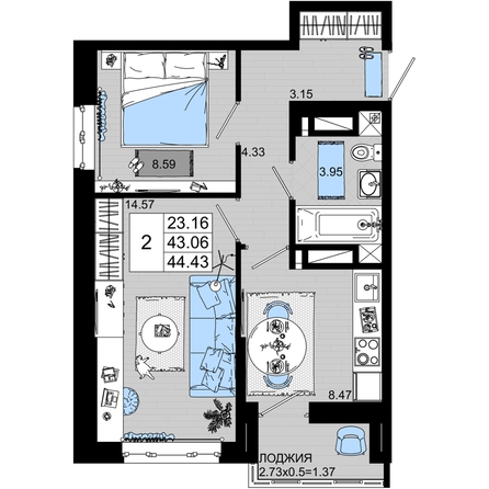 Общая площадь квартиры — 44.43 кв.м. Тип дома — монолит-кирпич. Компания-застройщик — ССК.