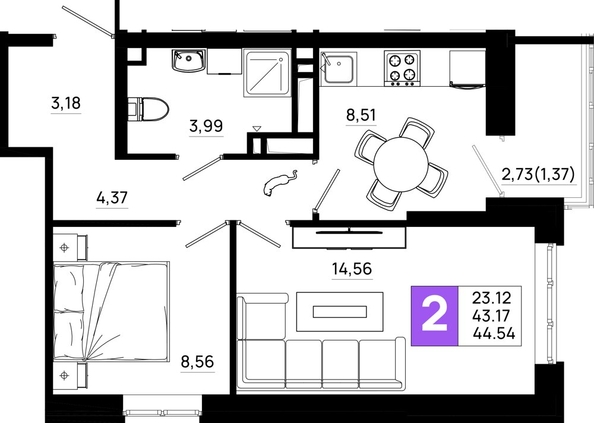 Общая площадь квартиры — 44.54 кв.м. Тип дома — монолит-кирпич. Компания-застройщик — ССК.