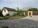 Двор выстелен плиткой, навес под 2 машины, свой плодоносящий сад , большая и красивая цветочная клумба.