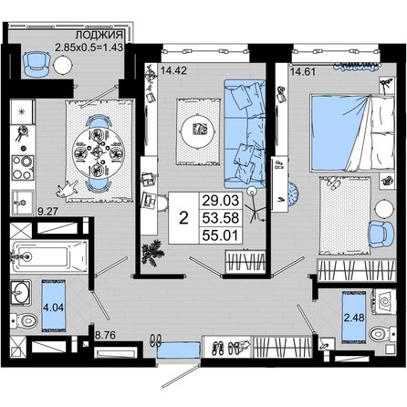 Общая площадь квартиры — 55.01 кв.м. Тип дома — монолит-кирпич. Компания-застройщик — ССК.