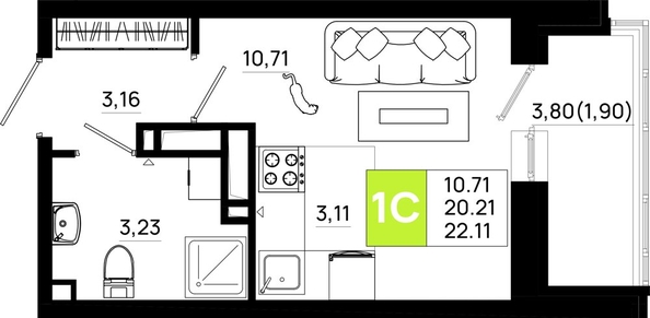 Общая площадь квартиры — 22.11 кв.м. Тип дома — монолит-кирпич. Компания-застройщик — ССК.