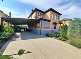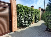 Фасад участка 23.4 м. Забор кирпичный. Парковка в гараже и во дворе под навесом. В гараже и на въезде установлены автоматические ролставни.