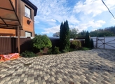 Двор выложен тротуарной плиткой. Ландшафтный дизайн.