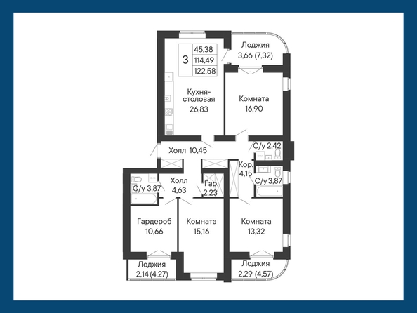 Данное планировочное решение представляет собой уникальный формат просторной трехкомнатной квартиры, в котором предусмотрены: мастер-спальня с большой гардеробной и лоджией, угловая лоджия во второй мастер-спальне с окнами в ванной комнате, выходы на еще одну угловую лоджию из большой кухни-столовой и соседней комнаты. Номер объявления SD61-93609.