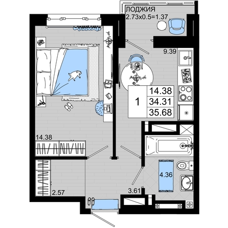 Общая площадь квартиры — 35.68 кв.м. Тип дома — монолит-кирпич. Компания-застройщик — ССК.