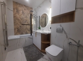 В общей зоне размещен современный санузел с ванной, тропическим душем, стиральной и сушильной машинами, инсталляцией и функцией гигиенического душа.