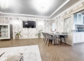 Гостиная/столовая оформлена в классическом стиле с большим количеством света. Все люстры и бра Bohemia (Чехия).