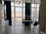 Квартира с панорамными окнами и небольшим балконом с красивым видом на море и город.