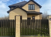 Фасад с забором из евро штакетника, по периметру -металлопрофиль.