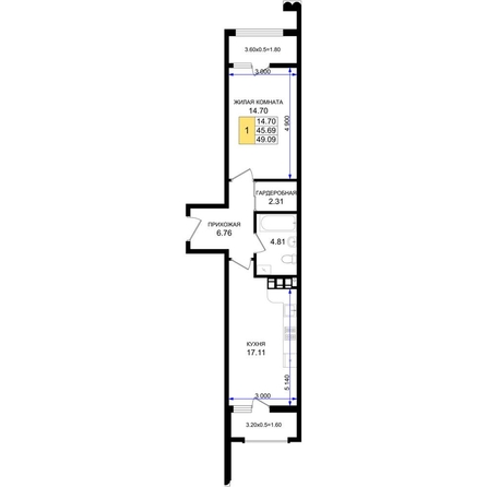 Жилая площадь 14.7 м2, кухня 17.11 м2, предчистовая отделка, комнаты изолированные.