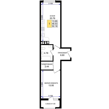Жилая площадь 13.95 м2, кухня 20.76 м2, предчистовая отделка, комнаты изолированные.